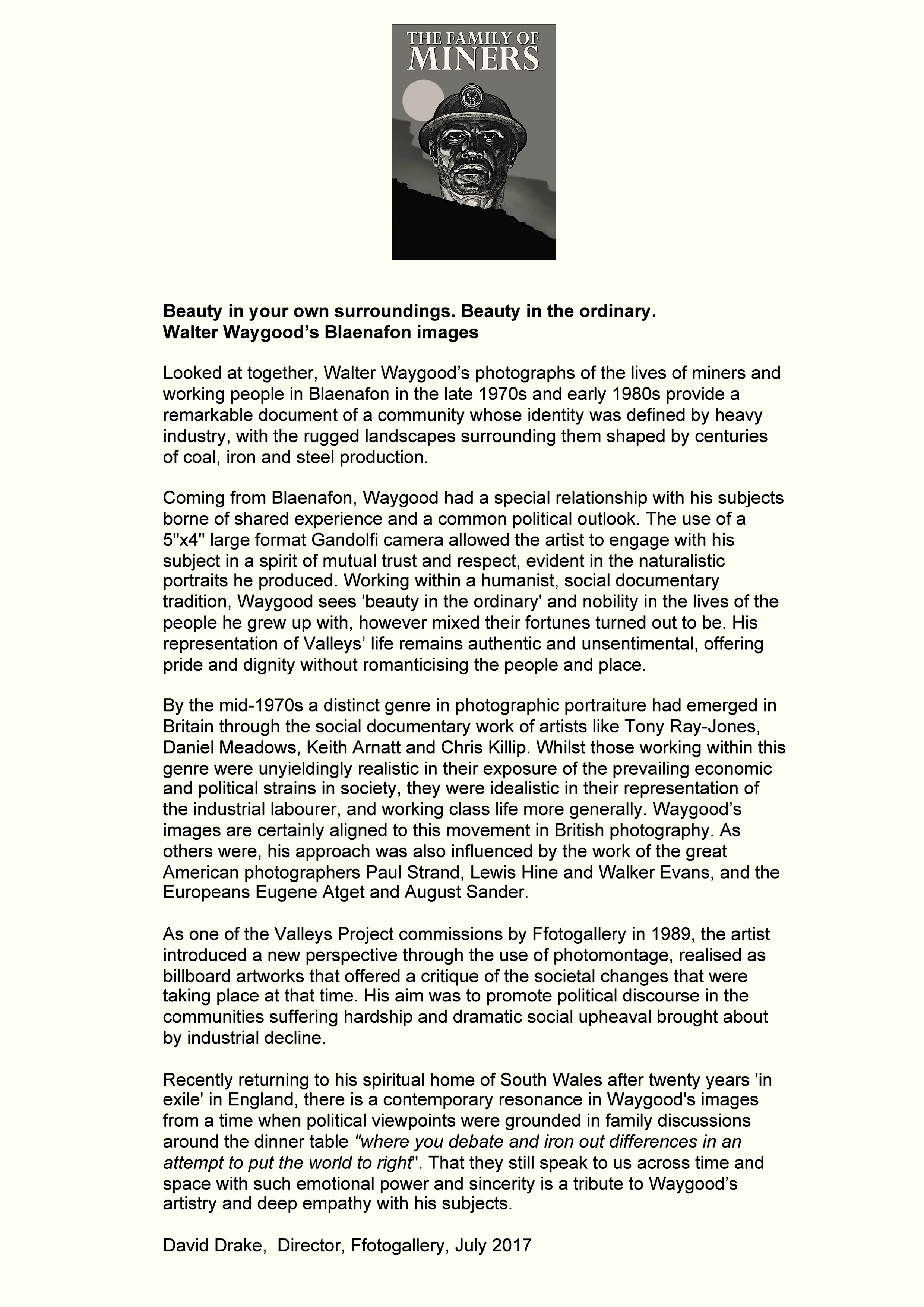 An upcoming exhibition of his work at Big Pit Mining Museum commences 21st August 2017 featuring ten commissioned panels of images taken in the 1970s-1980s forming 'The Family of Blaenafon' display. Also for the first time will be shown a unique collection of mining pictures which have just been purchased by the National Museum of Wales - twenty images will be exhibited forming a body of work 'The Family of Miners'.